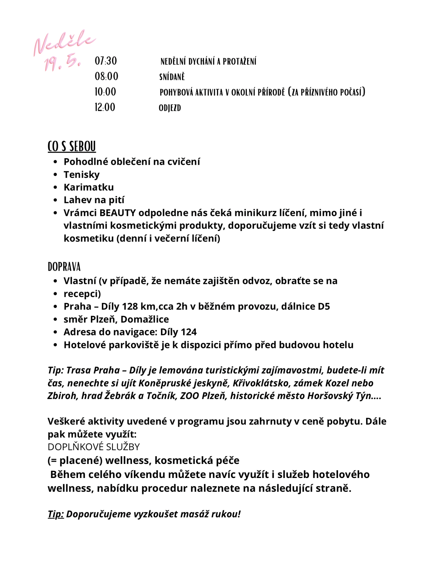 Proto starosti nechte za dveřmi a užijte si relax, péči o sebe i nabitý program, jak se patří a jak si zasloužíte. A pokud by se přeci jen čirou nááááhodou objevilo něco, co by Vaši nastolenou pohodu a klid narušovalo, neváhejte se na nás obrátit1. Bude-li to v našich silách a kompetencích, rády situaci vyřešíme.